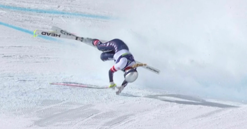 Efter att ha dragit korsbandet i slutet av januari hade amerikanen till slut tagit beslutet att ändå ställa upp i mästerskapet, trots motstånd från läkare. Nu riktades alla ögon på amerikanens första åk under premiären i störtloppet. Men loppet hann knappt börja innan det var slut för stjärnans del.