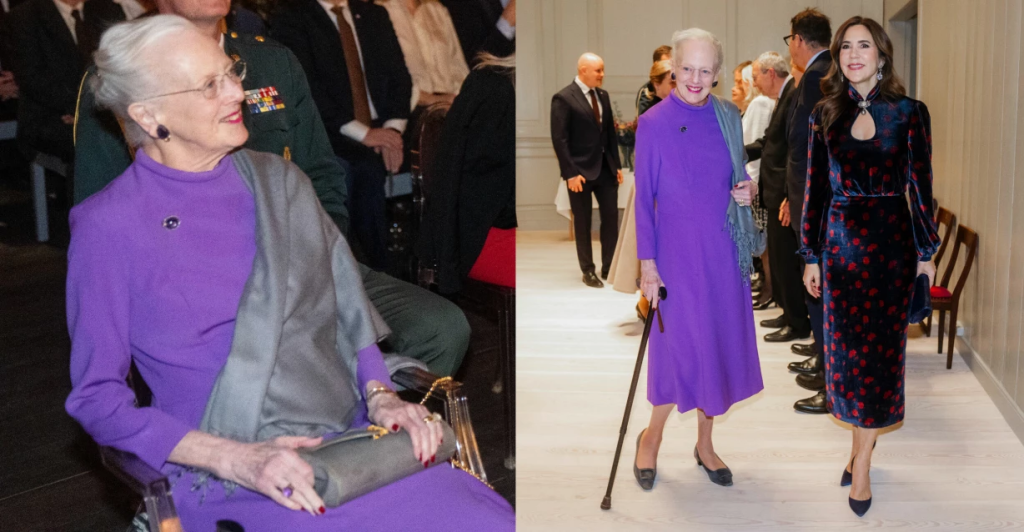 Dronning Margrethe på opgave igen – lidt over et døgn efter hoffets sygdomsmeddelelse. Klædt i lysende lilla og med et gråt sjal elegant draperet over den ene skulder.