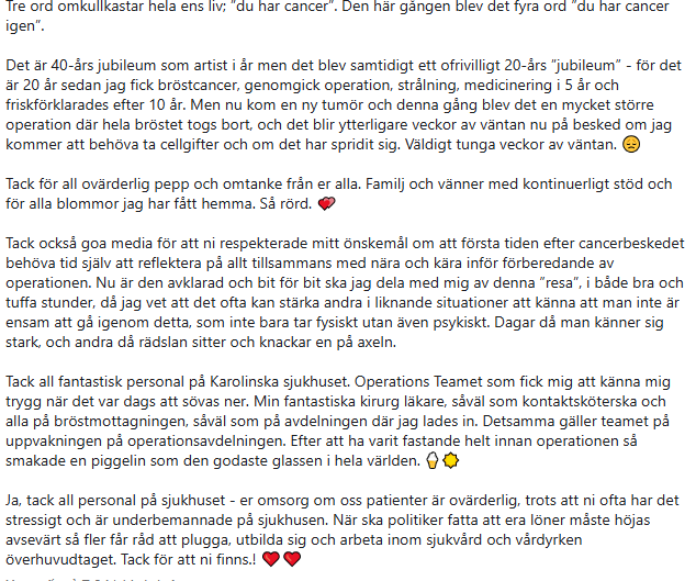 “Det blir ytterligare veckor av väntan nu på besked om jag kommer att behöva ta cellgifter och om det har spridit sig. Väldigt tunga veckor av väntan”, skrev hon på Instagram.