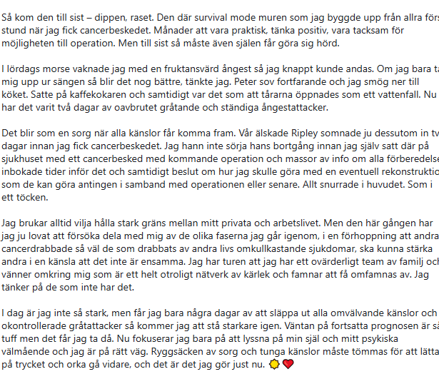 ”Vår älskade Ripley somnade ju dessutom in två dagar innan jag fick cancerbeskedet. Jag hann inte sörja hans bortgång innan jag själv satt där på sjukhuset med ett cancerbesked med kommande operation och massor av info om alla förberedelser inbokade tider inför det och samtidigt beslut om hur jag skulle göra med en eventuell rekonstruktion som de kan göra antingen i samband med operationen eller senare. Allt snurrade i huvudet. Som i ett töcken.”