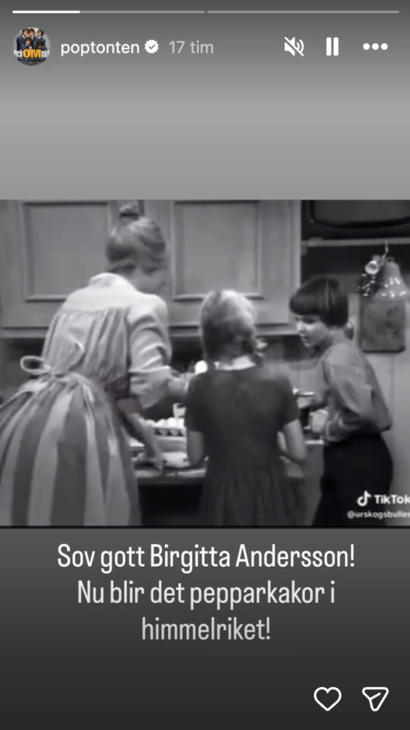 “Sov gott Birgitta Andersson. Nu blir det pepparkakor i himmelriket”, skriver Niklas Andersson till klippet.