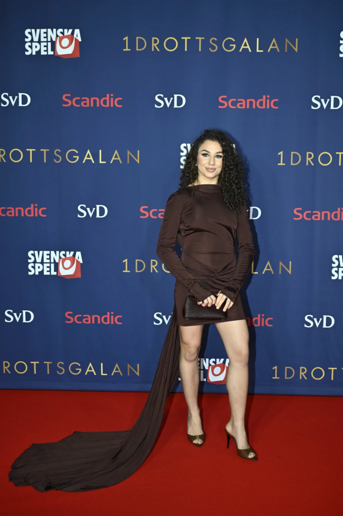 2025 års nykomling Tara Babulfath satsar på en kortare klänning och en helt brun look för årets Idrottsgala. Jag gillar den diskreta urringningen med de långa ärmarna, även om jag tror att en off shoulder-variant hade varit pricken över i:et här. Det smala släpet är ett försök att tillföra en viss dramatik, men här riskerar den mer att kännas som en efterkonstruktion snarare än en del av designen. Pluspoäng för färgmatchningen av klackskorna och väskan!