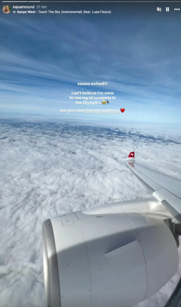 “Så exalterad! Kan inte förstå att jag är påväg att se min pojkvän tävla i OS. Ses snart”, skriver hon på Instagram från flygplanet.