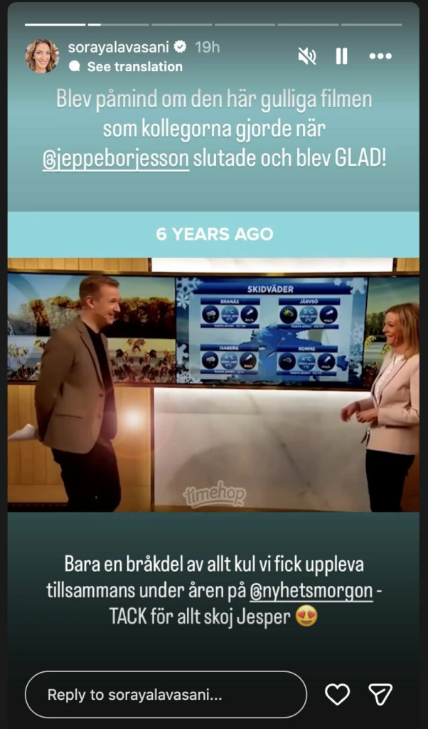 “Bara en bråkdel av allt kul vi fick uppleva tillsammans under åren på @nyhetsmorgon. TACK för allt skoj Jesper 😍”, skriver hon på Instagram story.