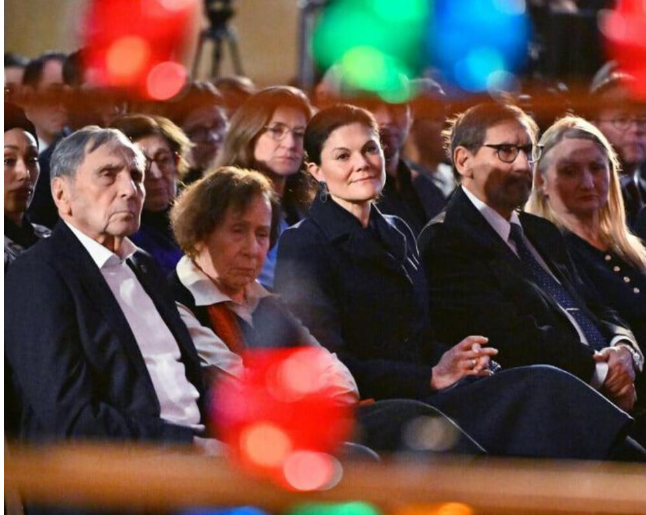 Vid sin sida hade Victoria paret Jovan och Dina Rajs, överlevande båda två. Och ett par platser bort satt Stefan och Ulla Löfven. Statsminister Ulf Kristersson höll ett av kvällens tal och den amerikanske psykologen och historikern Henry Hank Greenspan talade också.